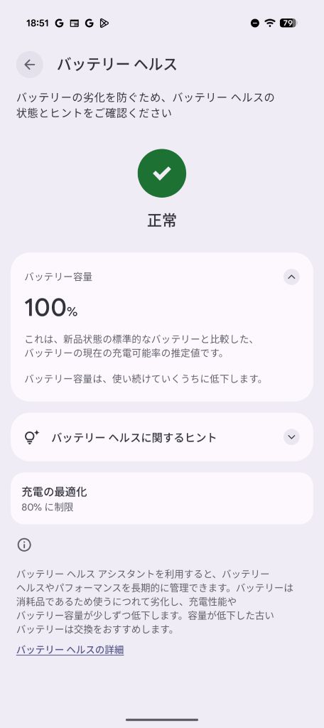 バッテリーの健康状態は設定アプリで確認できますが、大雑把にしかわかりません。