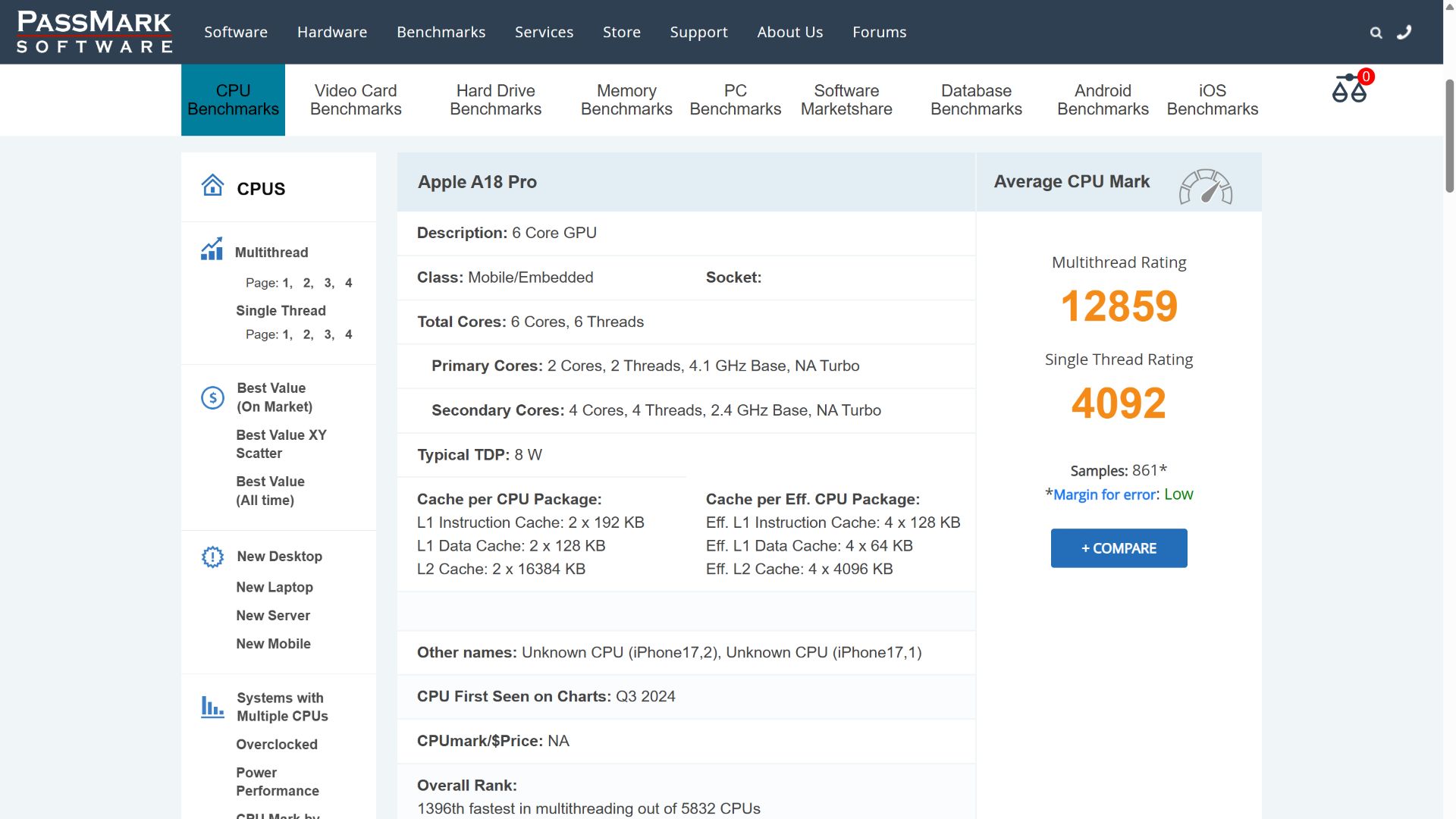 MacBook Neo(A18 Pro)で公表されたPassMark CPU Markの平均スコアは12859でした。(サンプル861時点)