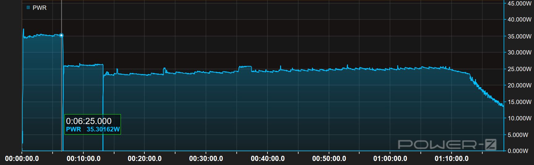 付属充電器(MYD-17-EN)を利用すると、最初の5分ぐらいだけ35Wぐらい出るのでスピードが速いだけでした。充電中は多少は45W 付属充電器のほうが速いですが、最終的な充電完了時間に違いは殆どありません。