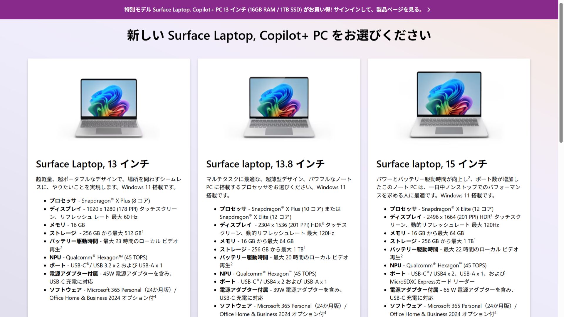 現行モデルのSurface Proは第11世代、Surface Laptopは第7世代ですが、公式サイトでは世代名はなく、AIPCを意味する「Copilot+PC」と画面サイズのみが表記されています。