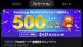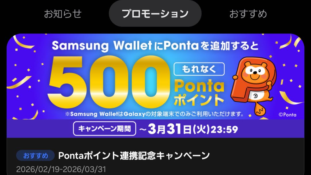 3月31日までの期間中、Samsung WalletにPontaカードを登録するともれなく500ポイントが付与されるというかなりお手頃なキャンペーンです。
