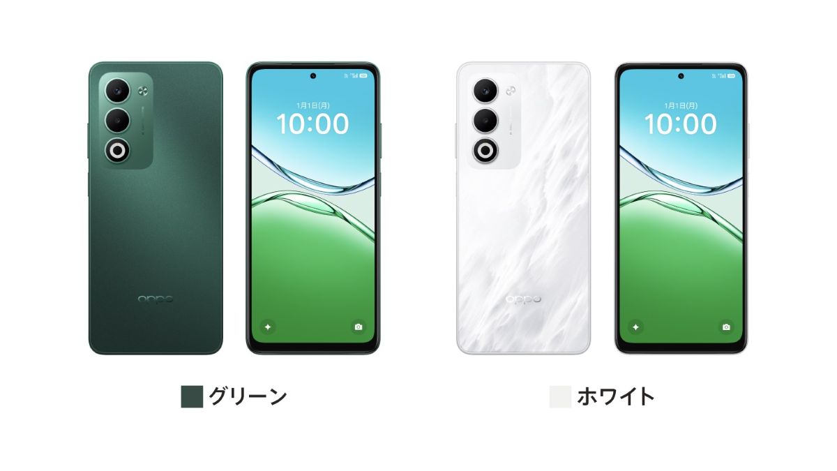カラーはホワイトまたはグリーンで、上位モデルのOPPO Reno14 5Gを彷彿とさせる高級感あるデザインです。