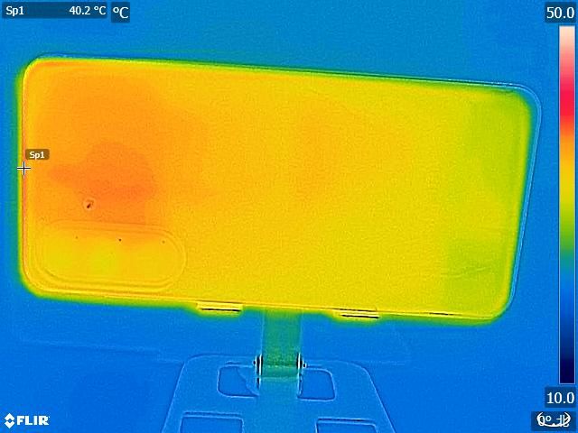 スコアの低下は皆無で、またサーモカメラで本体の背面をチェックしましたが発熱はかなり抑えられていました。フレームが部分的に40℃近くまで上昇しますが、背面やパネルは手に持っていて不快感のない温度です。