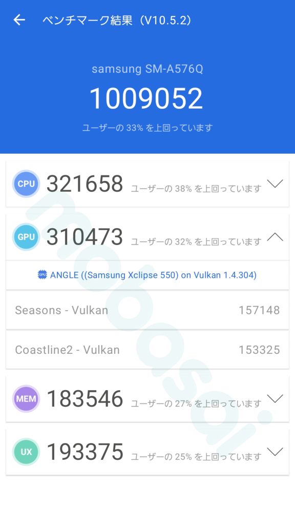 スコアは高くないのでExynosプロセッサーにはベンチマーク側が最適化していないものと思われます。基本的にこのベンチマークはSnapdragon向けです。スナドラなら下位モデルでも200000点以上出ています。