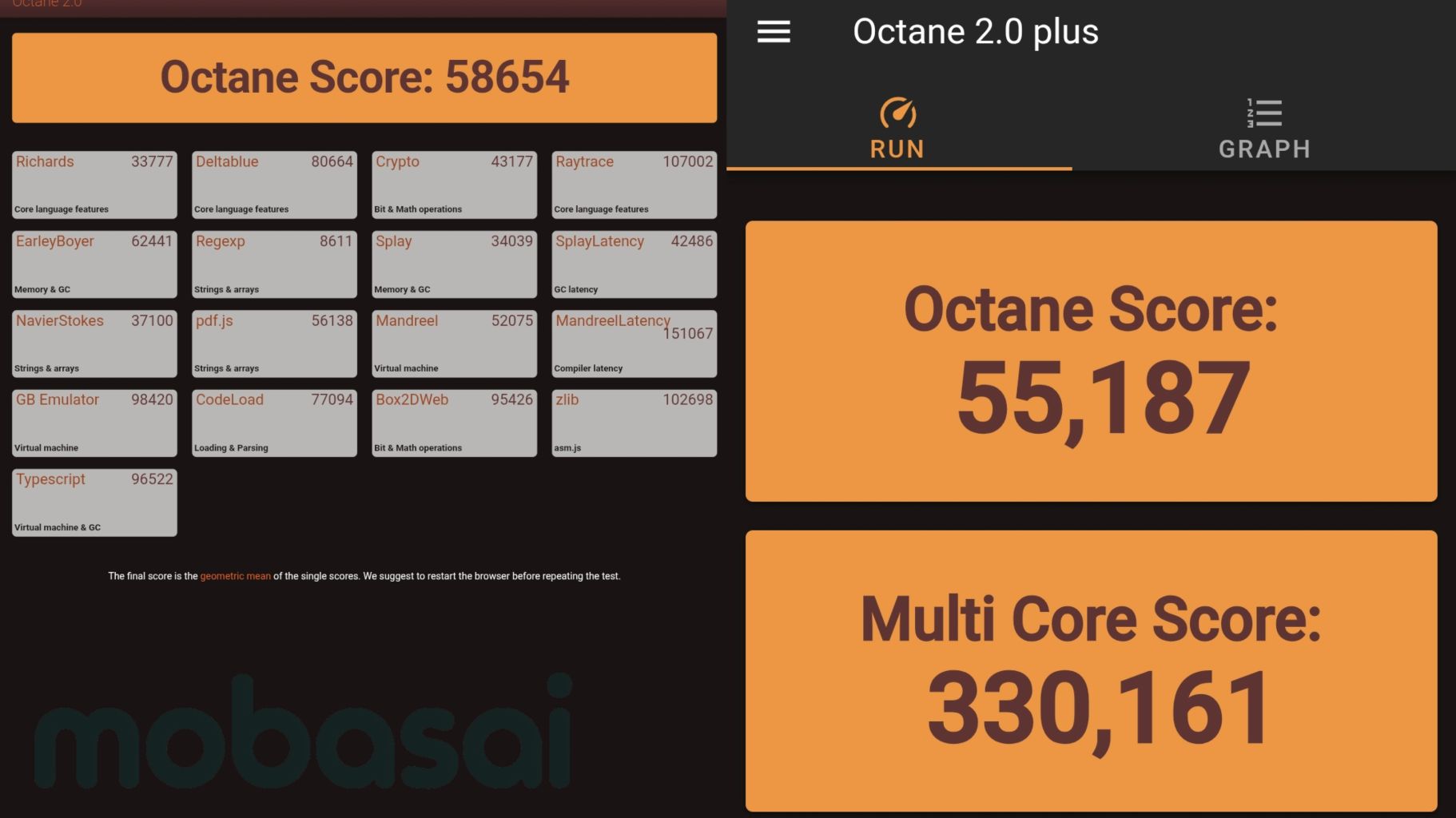 ブラウザベンチマークのGoogle Octane 2.0ではシングルスコア58654点、マルチスコア計測可能なOctane 2.0 Plusではマルチスコア330161点を記録しました。
