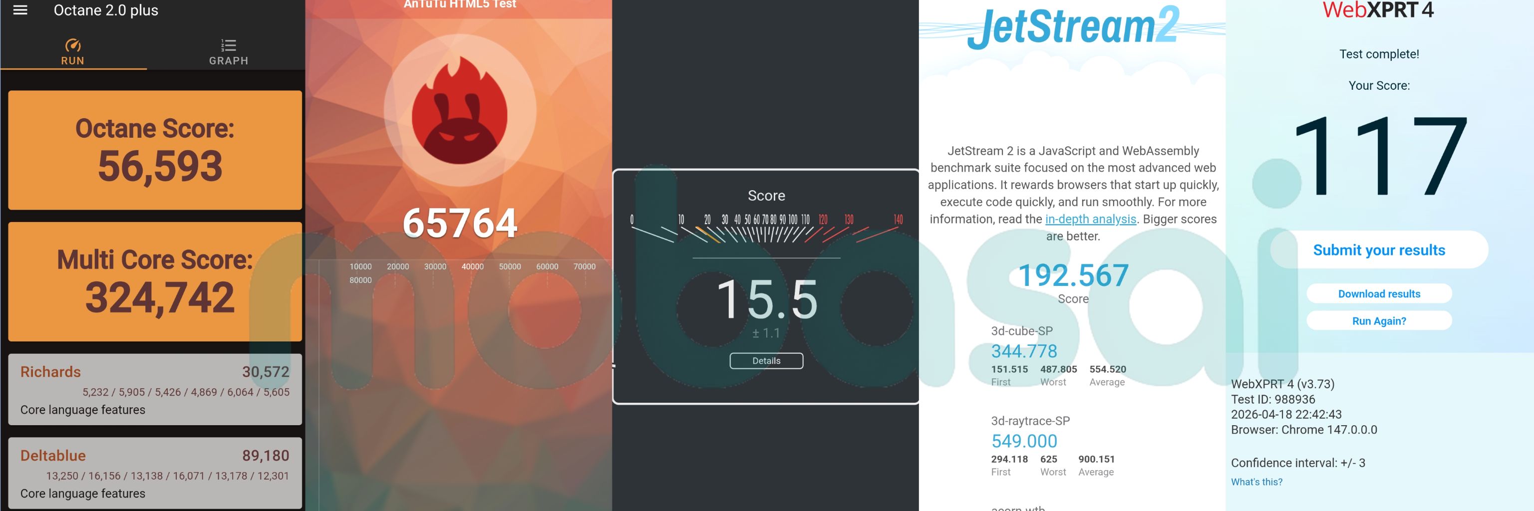 Google Octane 2.0Octane 2.0 PlusWebXPRT4AnTuTu HTML5 TestSpeedometer 3.1JetStream 2