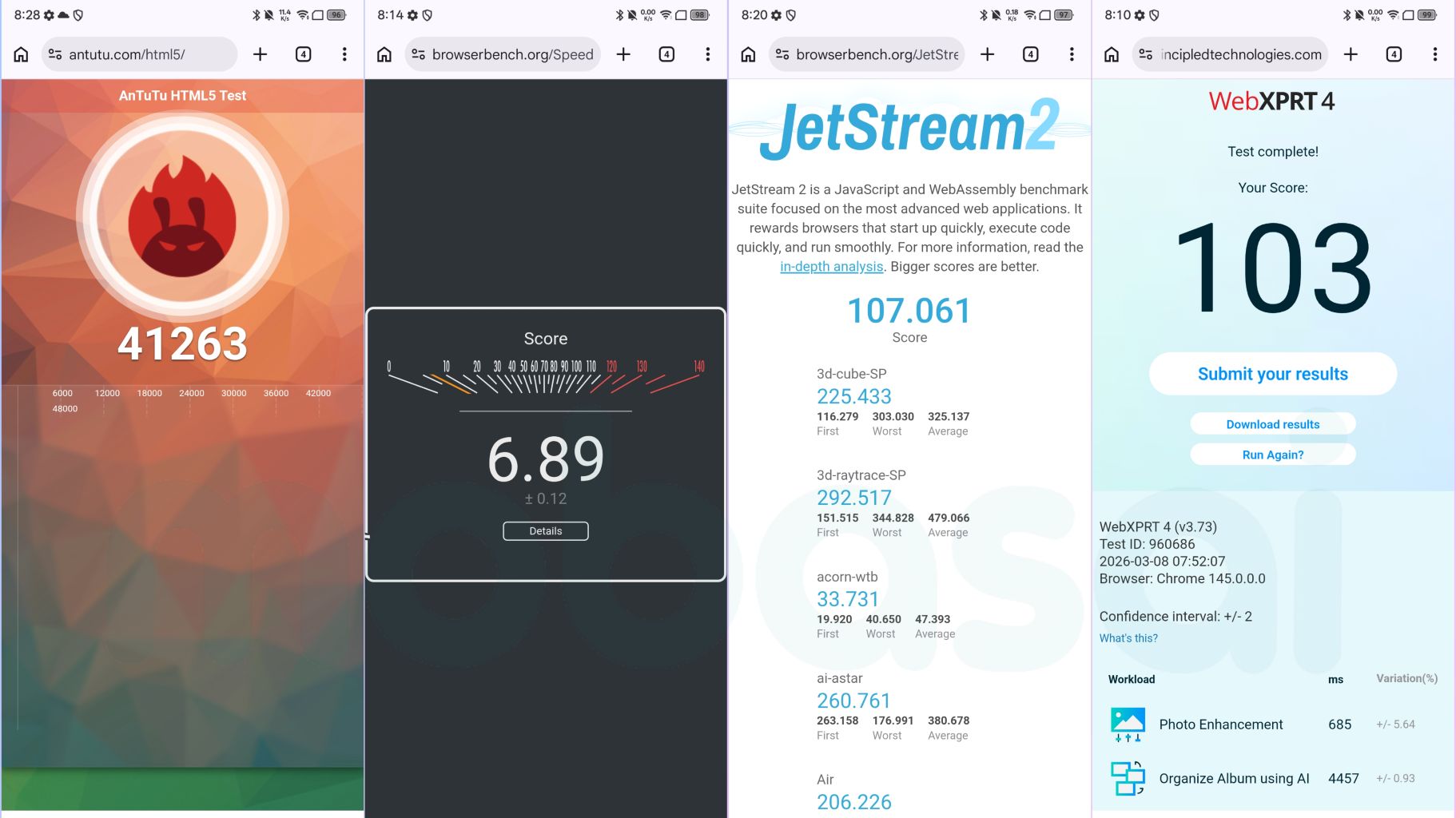 AnTuTu HTML 5 Test・Speedometer 3.1・JetStream2・WebXPRT4