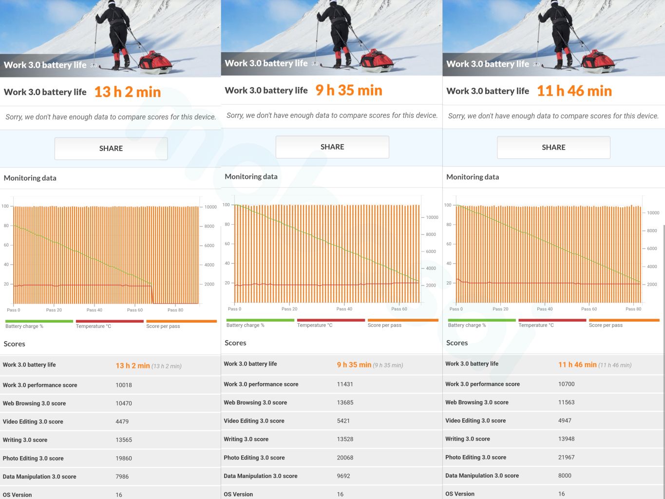 バッテリー持ちチェックにはPCMarkアプリのWork 3.0 battery lifeにて、条件を3回に分けてフル測定しました。