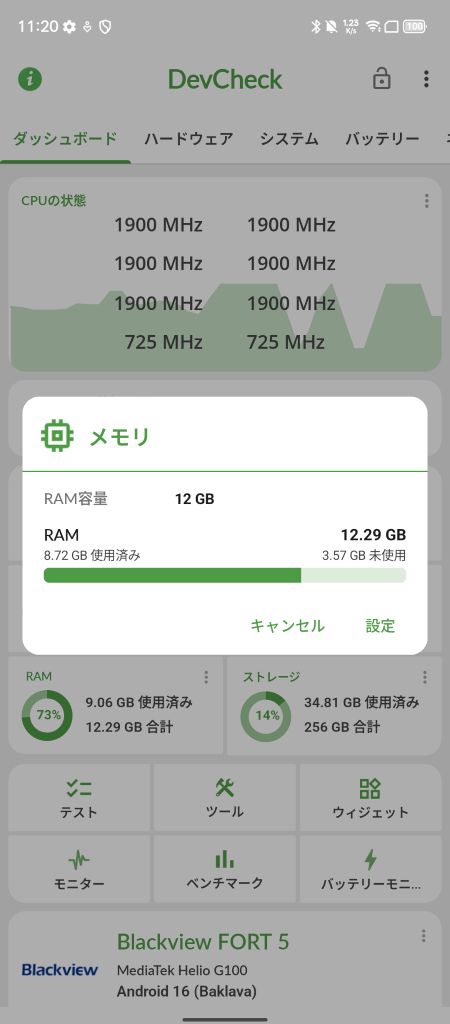 プロセッサーとしては力不足感が否めないMediaTek Helio-G100ですが、RAM 12GBを搭載している良い意味で珍しい構成となっているため、他のHelio-G99などを搭載するデバイスよりも動作が快適に感じます。SoCがエントリー向けであってもRAMがしっかりあれば動作は悪くない、という一つの実証となりました。