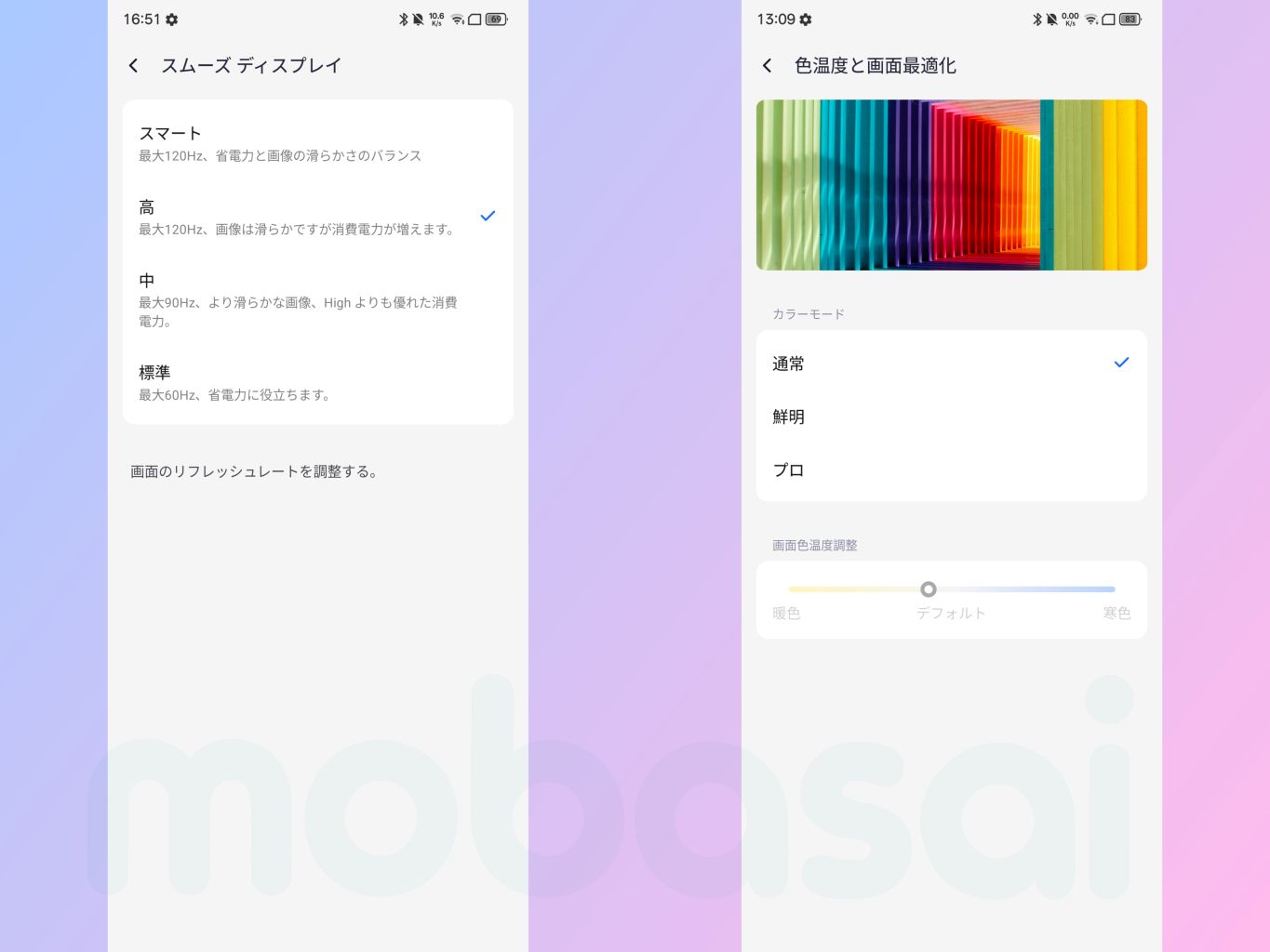 最大120Hzリフレッシュレートにすることで滑らかなスクロールができて、バッテリー持ちと滑らかさを両立できる90Hzも選択可能です。また画面の色温度調整も備えています。