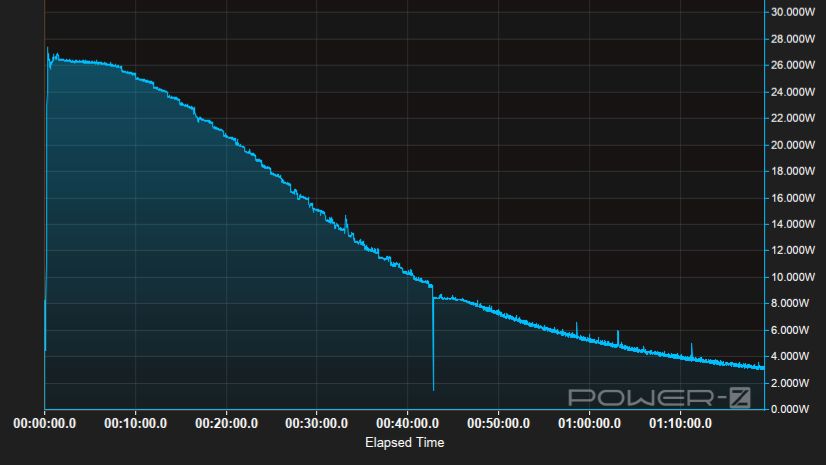今回は最大30Wの充電器だったので、充電中の最大出力数は27Wまでしか確認できませんでしたが、30分で55%分回復しているのでほぼフルスピードだと思われます。