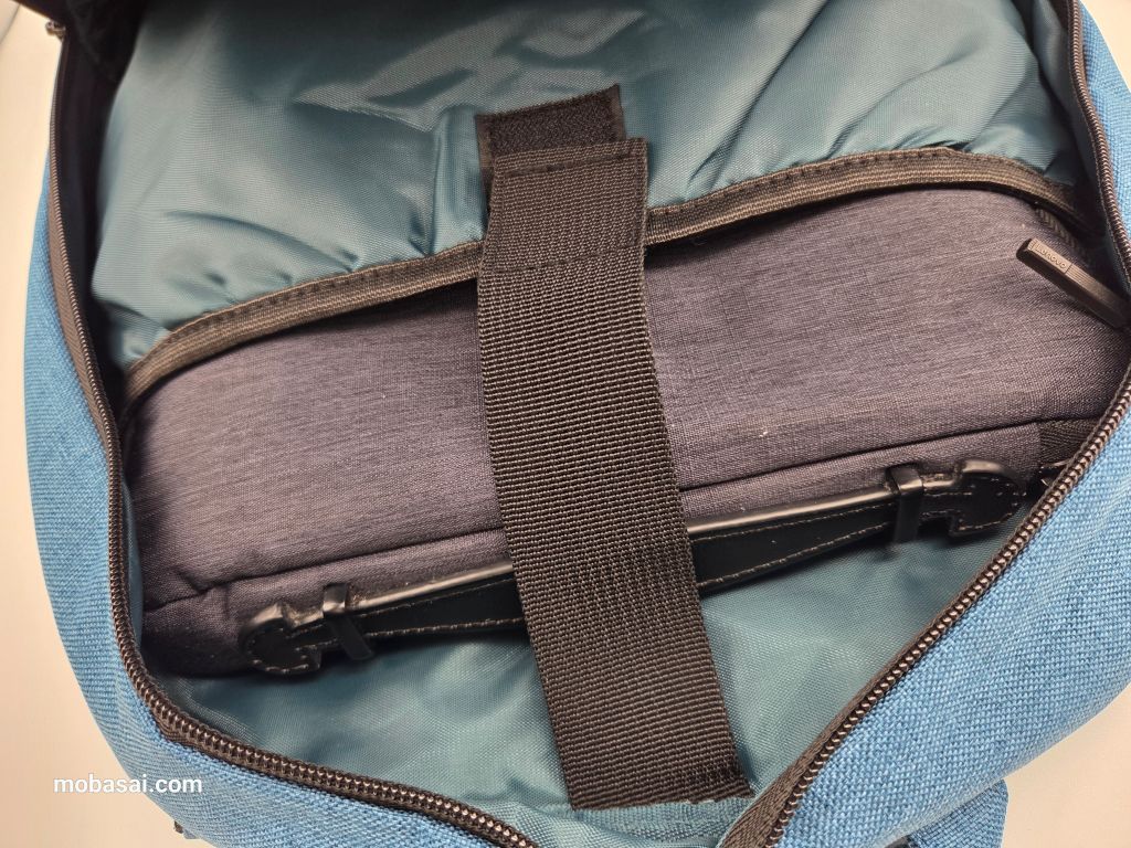 ここにモバイルバッテリーを仕込んでおくことで、背負いながら手に持ってるスマホを充電したりできます。
