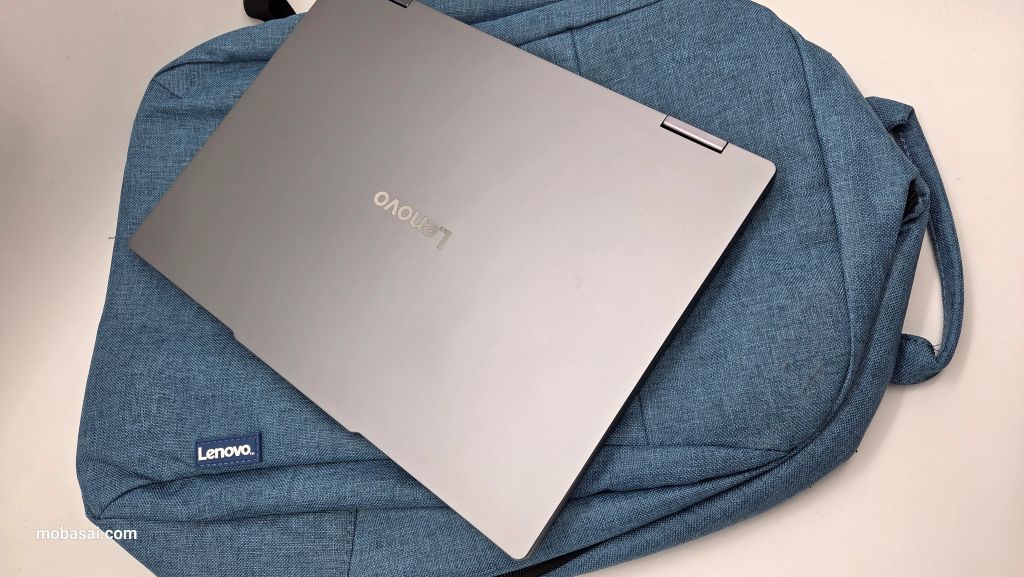 収納可能サイズは15.6インチ(255 x 22 x 362 mm 以下)のノートパソコンとなっています。近頃主流となりつつある、14インチ縦ワイド画面のLenovo IdeaPad 5i 2-in-1を入れてみた感じがこれです。