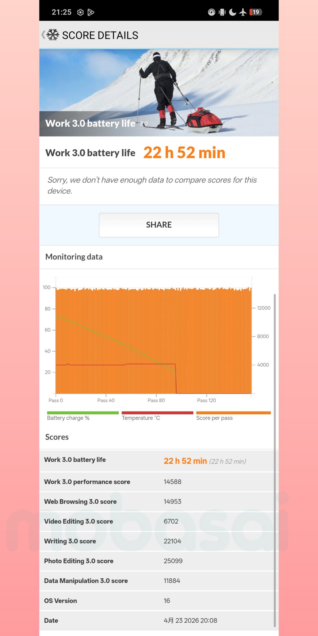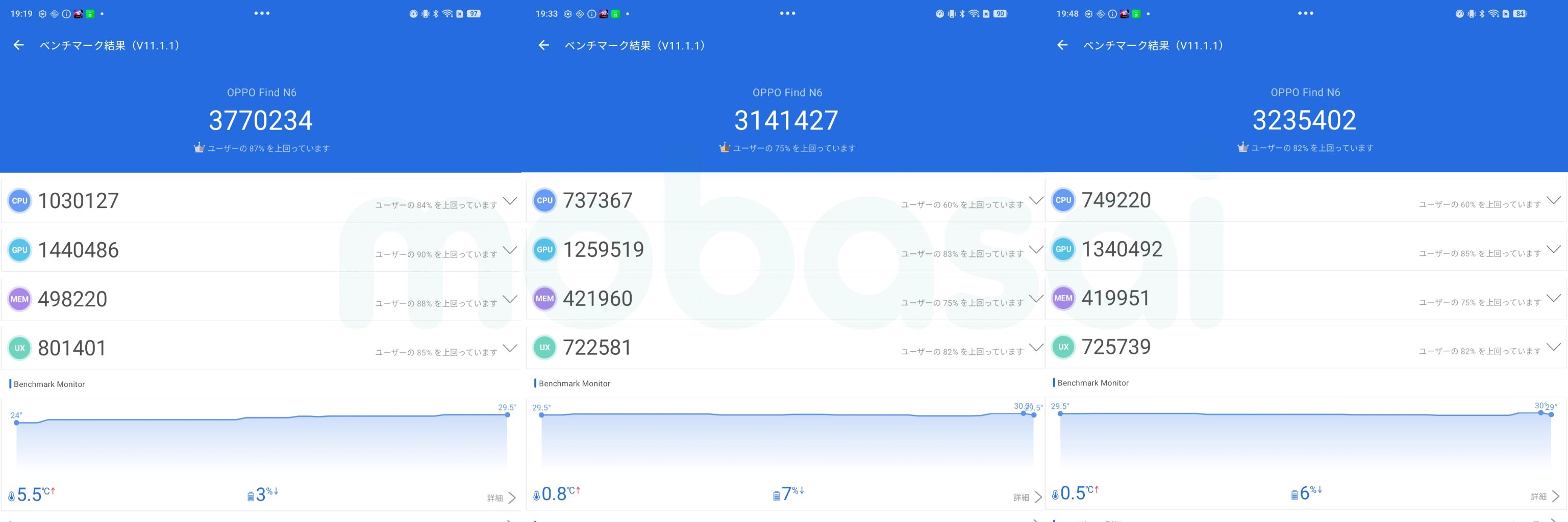 OPPO Find N6は6000mAhもの新世代な大容量バッテリーを搭載しています。PCMark Work 3.0 battery lifeを本体設定「高パフォーマンスモード」で測定した結果を以下に掲載します。