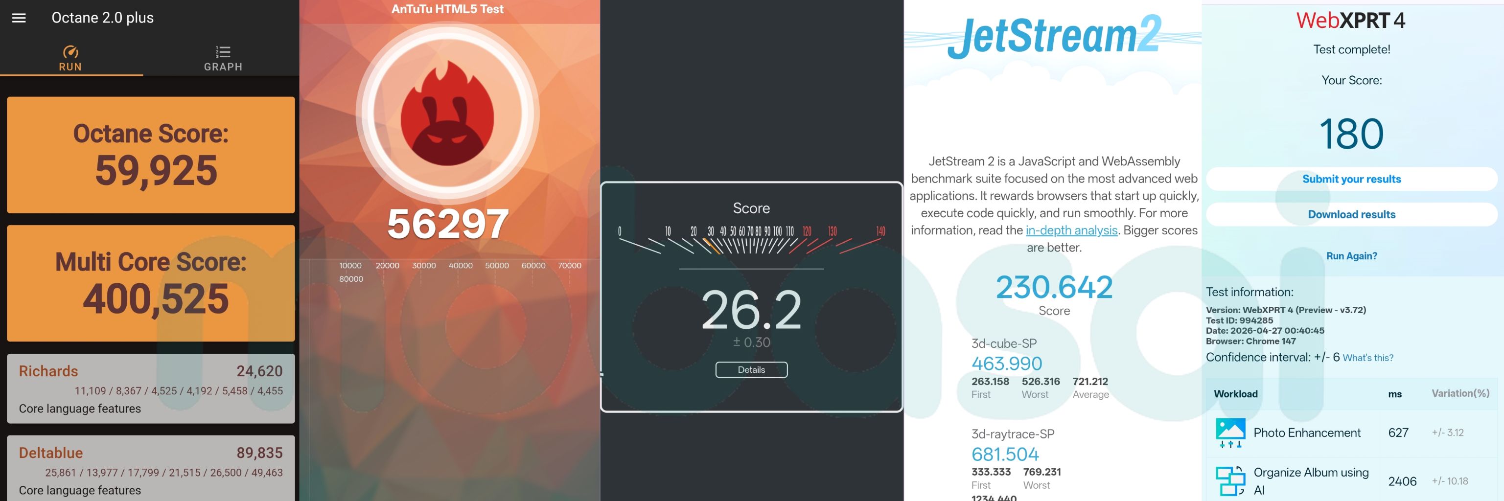 Google Octane 2.0Octane 2.0 PlusWebXPRT4AnTuTu HTML5 TestSpeedometer 3.1JetStream 2