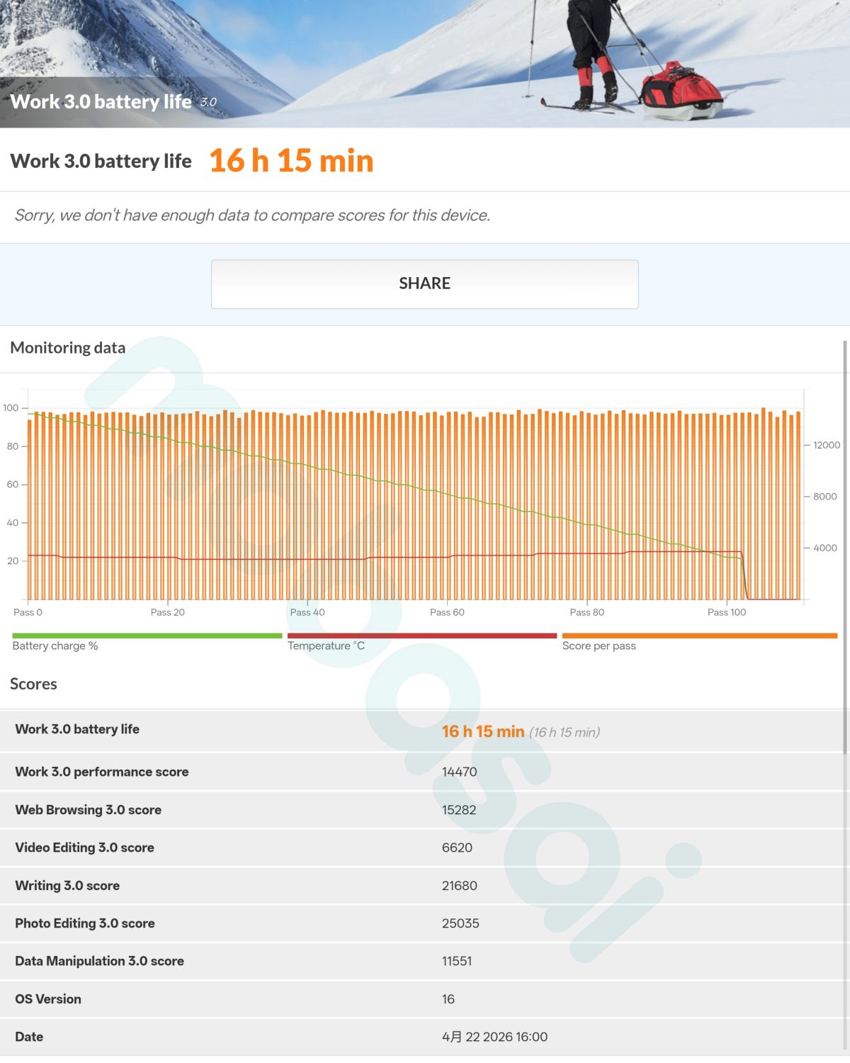 開いた状態では16時間15分を記録しました。タブレットに近い大きさでスマホとほぼ同じぐらいの駆動時間を実現しています。