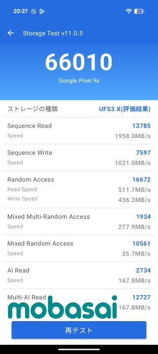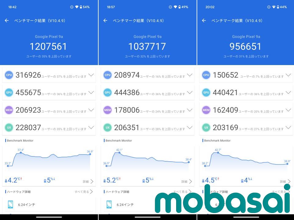 AnTuTu v10.4.9を連続で3回実行した結果です。(室温20度未満の涼しい初夏の室内で測りました。)