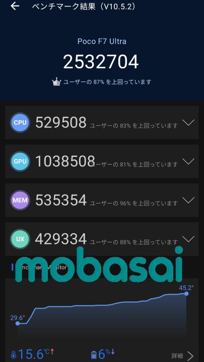 測定は Xiaomi POCO F7 Ultra(12GB/256GB)で行っています。POCO OS独自のパフォーマンス制御においては、究極モードで測定します。