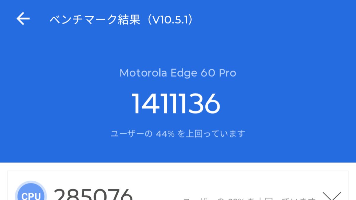 同チップセットを搭載したmotorola edge 60 pro を当サイトで性能計測したところ、AnTuTuスコアは1411136点でした。