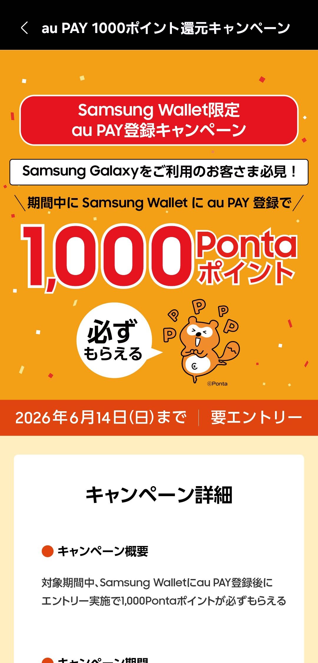au Payでも同様で、6月14日までの登録でこちらは一気にPonta 1000ポイントが付与されます。