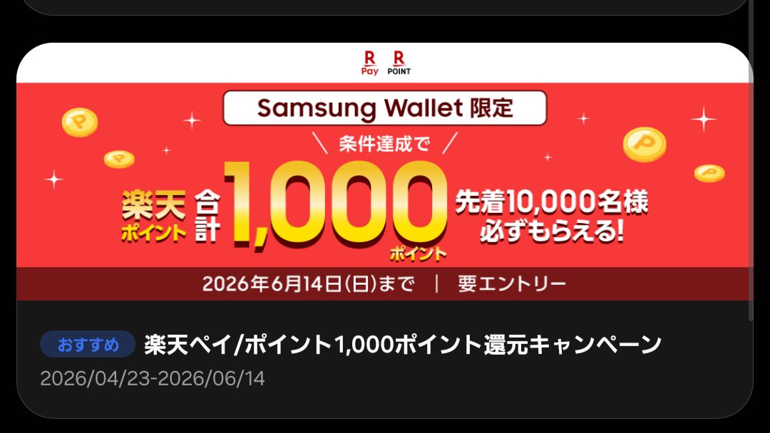 Samsung Walletにて、またもや新規カードの登録キャンペーンが開催されています。
