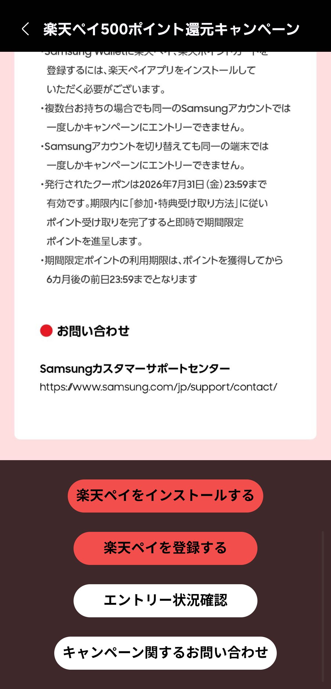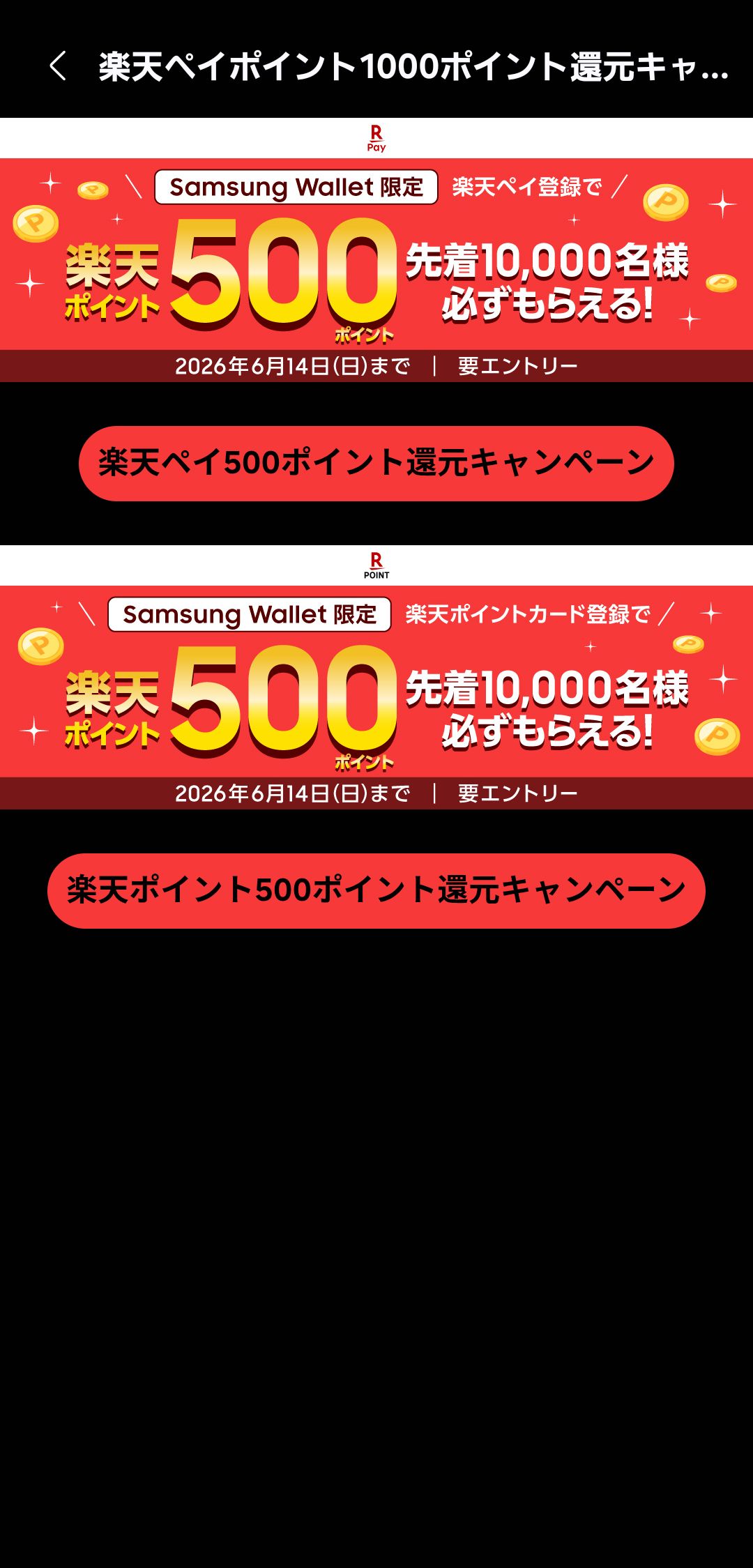 なお楽天ペイ・楽天ポイントカード登録で貰える500ポイントは先着10000名となっており、期間内に定員オーバーで終了してしまうことは目に見えています。この記事を見てくれたGalaxyユーザーの方はお早めの対応を。