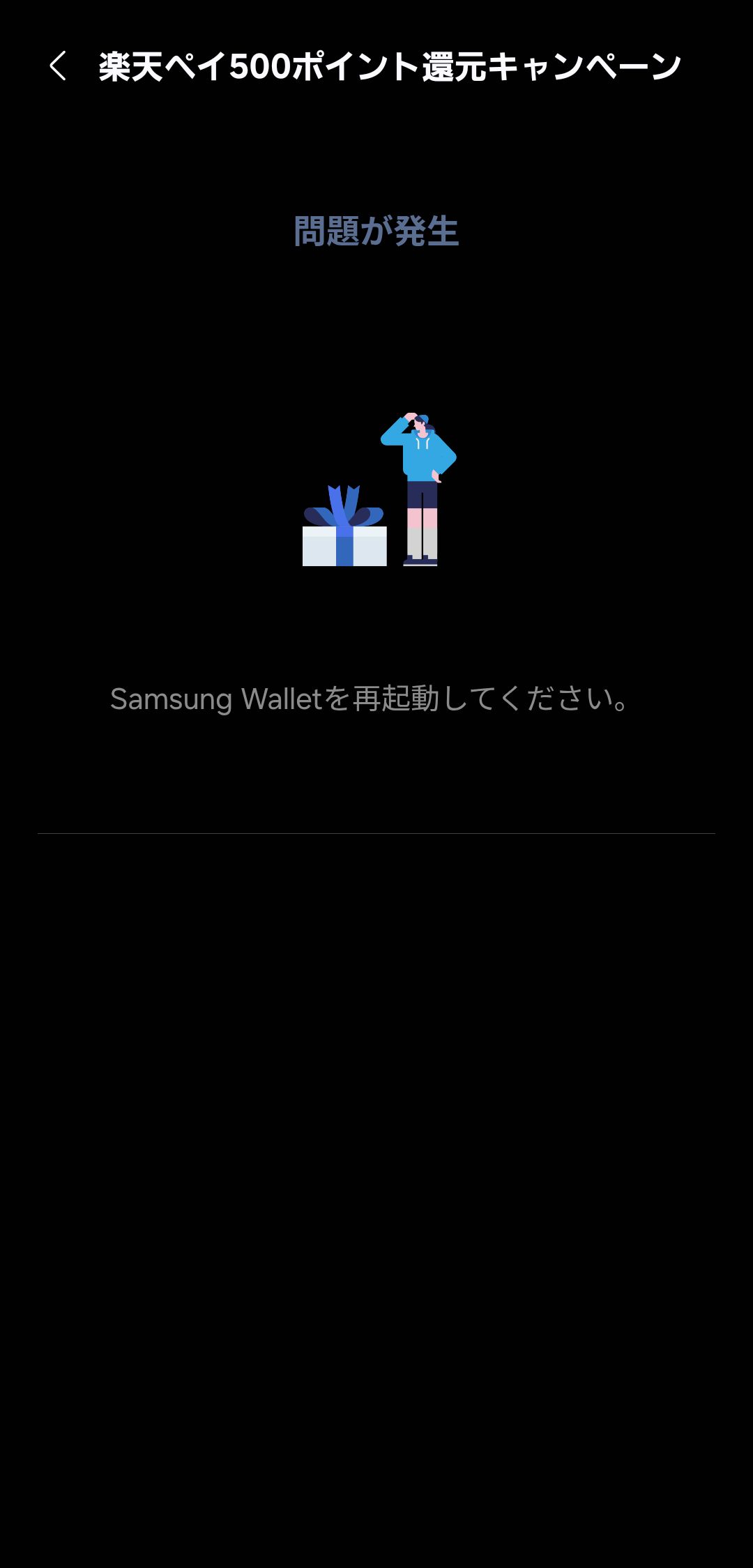 最初に述べた通り、Samsung Walletアプリを必ず最新版に更新してください。そうでないとエントリー後に下記のようなエラーが発生します。公式でも注意喚起が行われています。