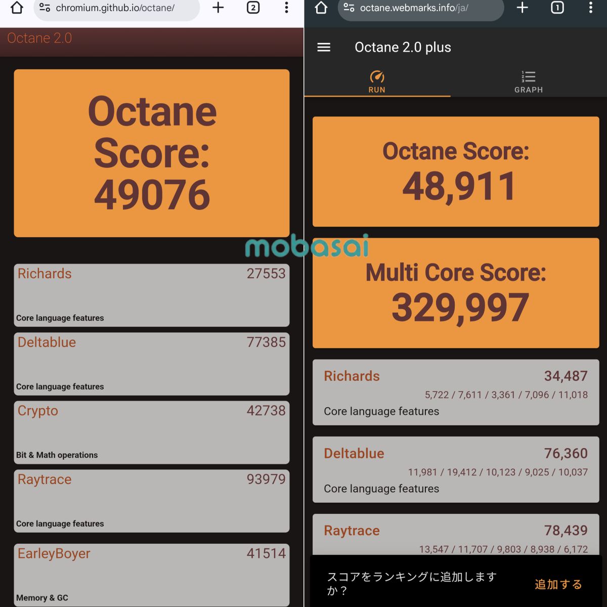 ブラウザベンチマークのGoogle Octane 2.0でのCPUスコアの計測では、シングルスコア49076点を記録しました。