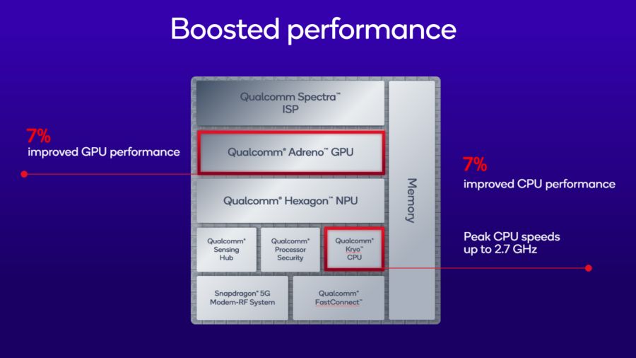 CPUおよびGPUの性能がともに7%向上したと公表しており、クロック数はプライムコアのCortex-A720が2.5GHzから2.7GHzへの上昇しているほか、GPUも同じAdreno 810ユニットを利用しています。