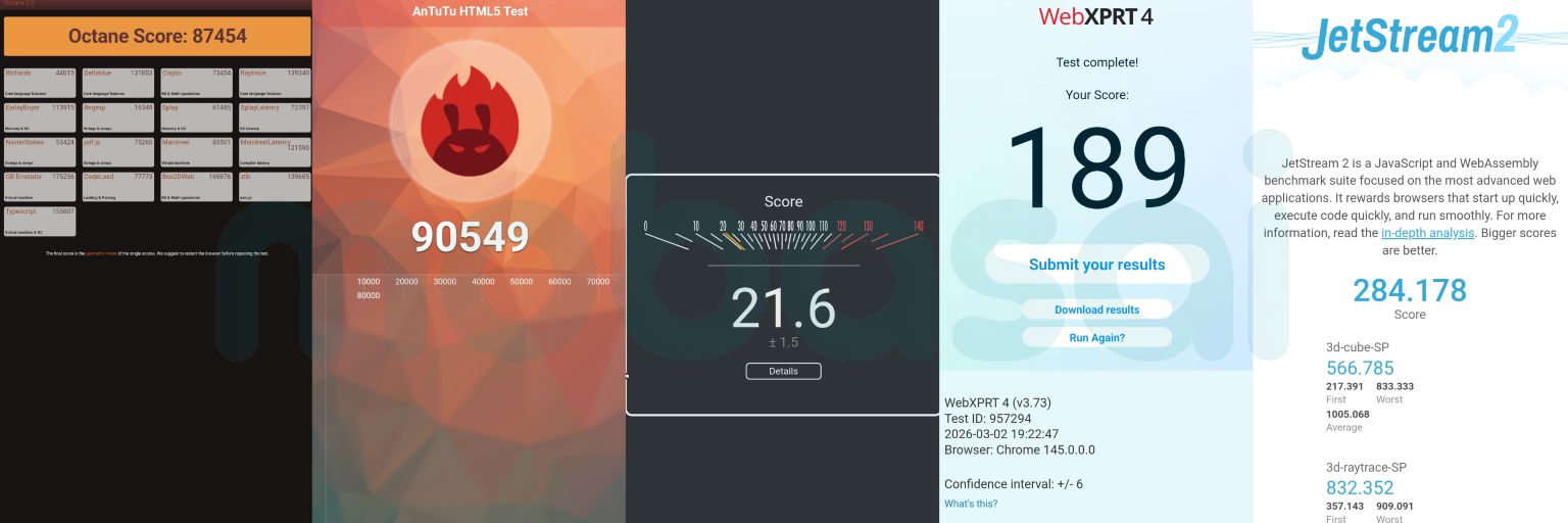 Google Octane 2.0Octane 2.0 PlusWebXPRT4AnTuTu HTML5 TestSpeedometer 3.1JetStream 2